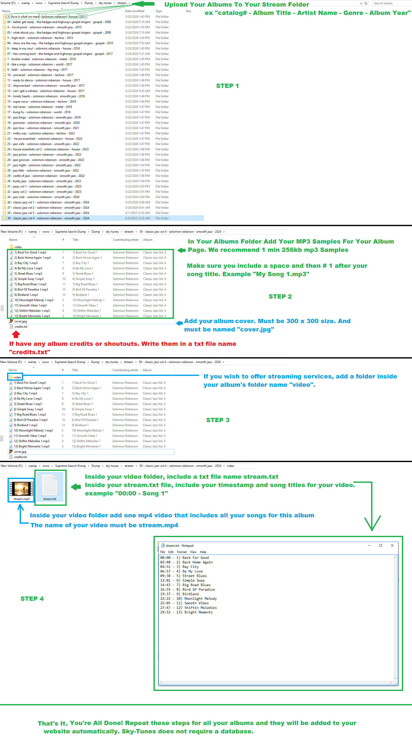 Enter a monthly price you wish to charge for streaming. Note: To provide streaming for your albums, you must upload an mp4 with all your songs listed in it and a txt file with the timestamp for each song. Your mp4 is used for streaming. Please visited this link, for information on how to upload your album's mp3's, covers, mp4's and more. Month Streaming is a Paypal membership where customers will have a login and password for streaming. You the admin must approve all new signups after payment.